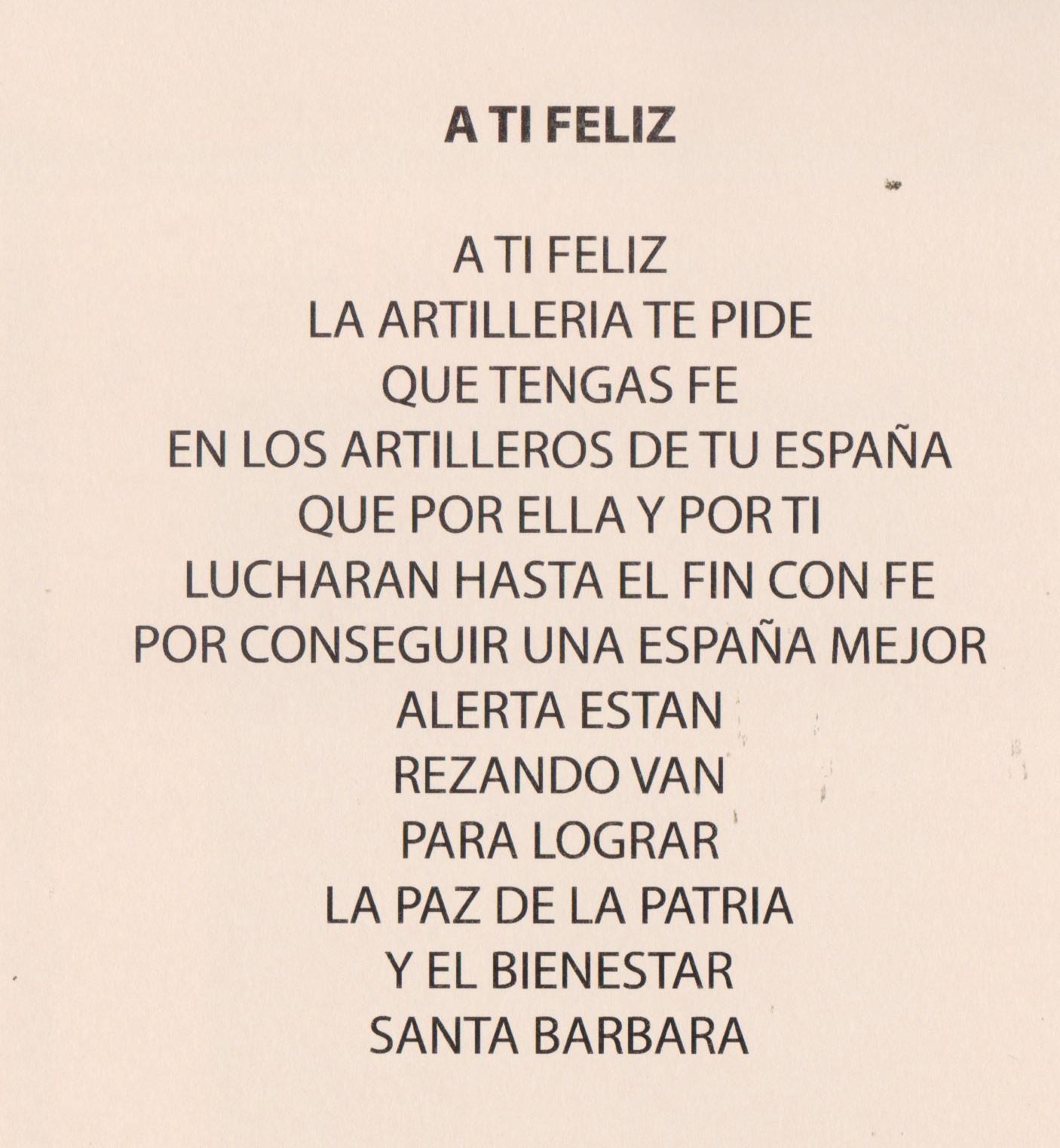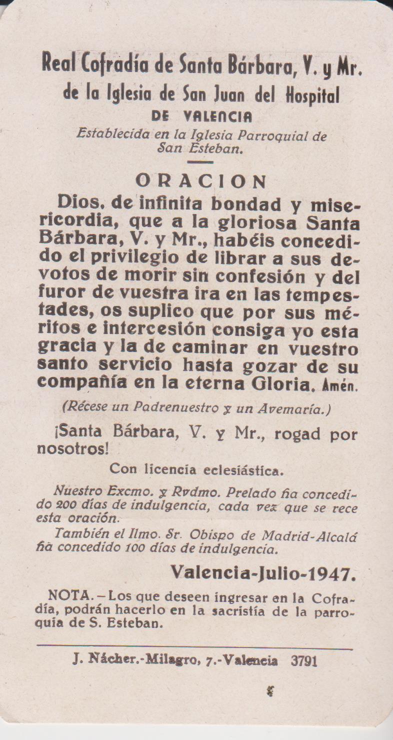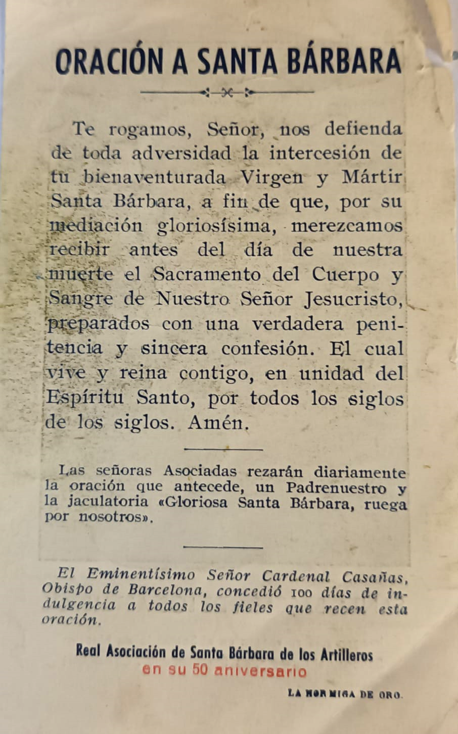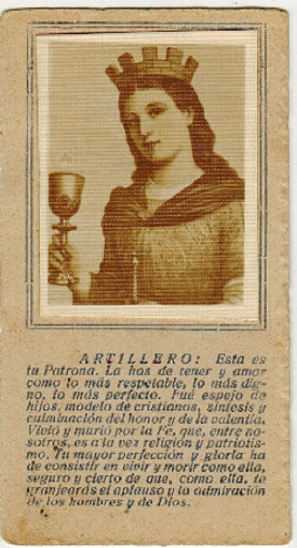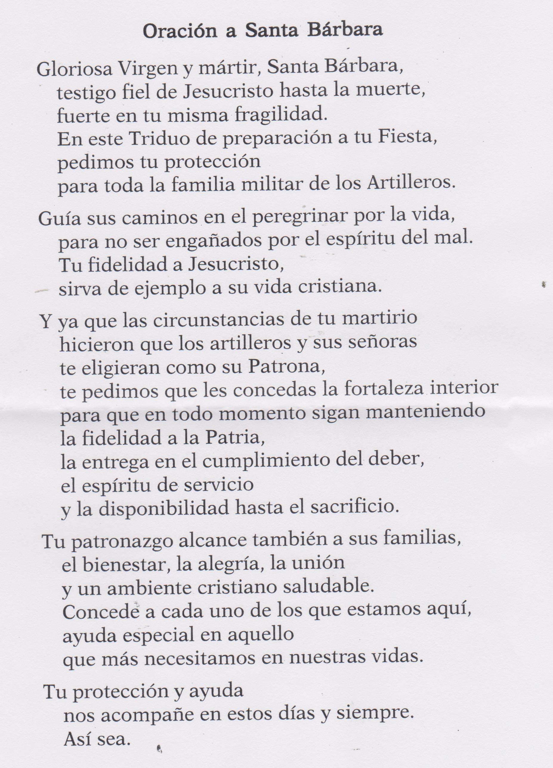 "Santa Bárbara, Virgen Bendita, Grandiosa de inmenso poder, Dios te acompañe, y Tu a mí por el camino del bien. Con tu espada vencedora líbrame del mal, de la injusticia, de la envidia y de los malos ojos. Con el poder del rayo protégeme de mis enemigos, glorifica la boca de fuego de mi cañón y permite que salga victorioso. Con el cáliz de tu copa y el vino mantén la fuerza de mi cuerpo y espíritu para la dura lucha y el combate. A mis manzanas y margaritas recíbelas como ofrenda de que te tengo siempre presente en mi pensamiento y en mi hogar, y te ruego no me abandones nunca y acudas a mi cada vez que te reclame para defender mi fe, mi tierra, mi familia y mis luchas; y que al final me lleves siempre a la gloria como Tú. Amén