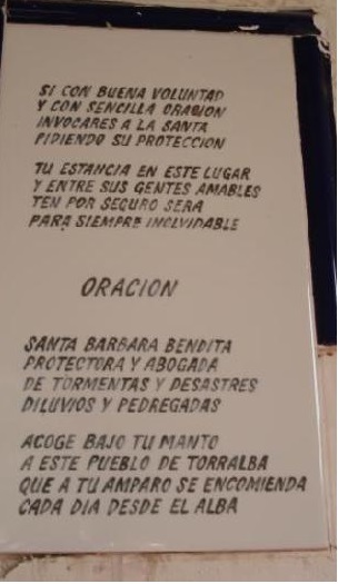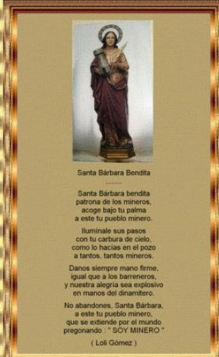 Santa Bárbara bendita, que en el Cielo estás escrita, en papel y agua bendita, guarda el pan y guarda el vino y a la gente de camino.