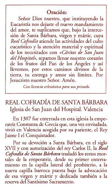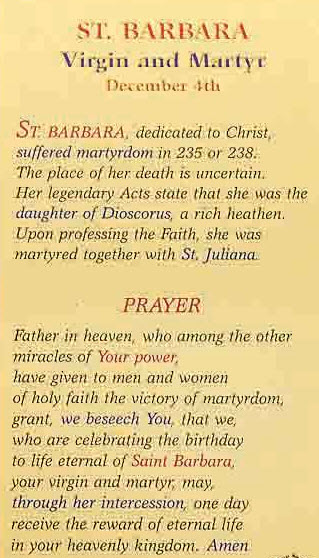 Padre Celestial, que entre los otros milagros de tu poder, has dado a los hombres y mujeres de santa fe la victoria del martirio, concédenos, te suplicamos, que nosotros, que estamos celebrando el cumpleaños a la vida eterna de Santa Bárbara, tu virgen y mártir, podamos, por su intercesión, recibir un día la recompensa de la vida eterna en tu reino celestial. Amén