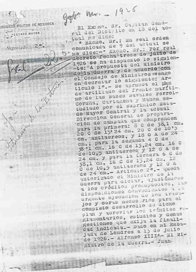 en la Comandancia de Menorca la Real Orden de 7 de Diciembre de 1928, que